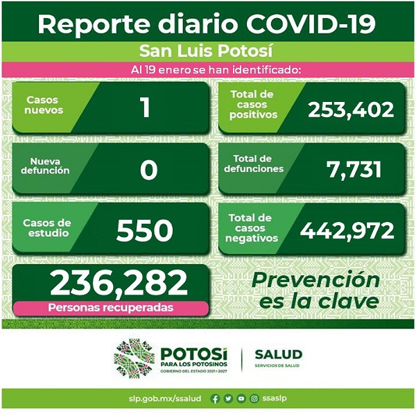El nuevo caso se detectó en la Jurisdicción Sanitaria I, en la capital; en las jurisdicciones sanitarias, II de Matehuala, III de Villa de Pozos, IV de Rioverde, V de Ciudad Valles, VI de Tamazunchale y VII de Tancanhuitz no se presentaron casos nuevos ni en personas residentes de otra entidad.