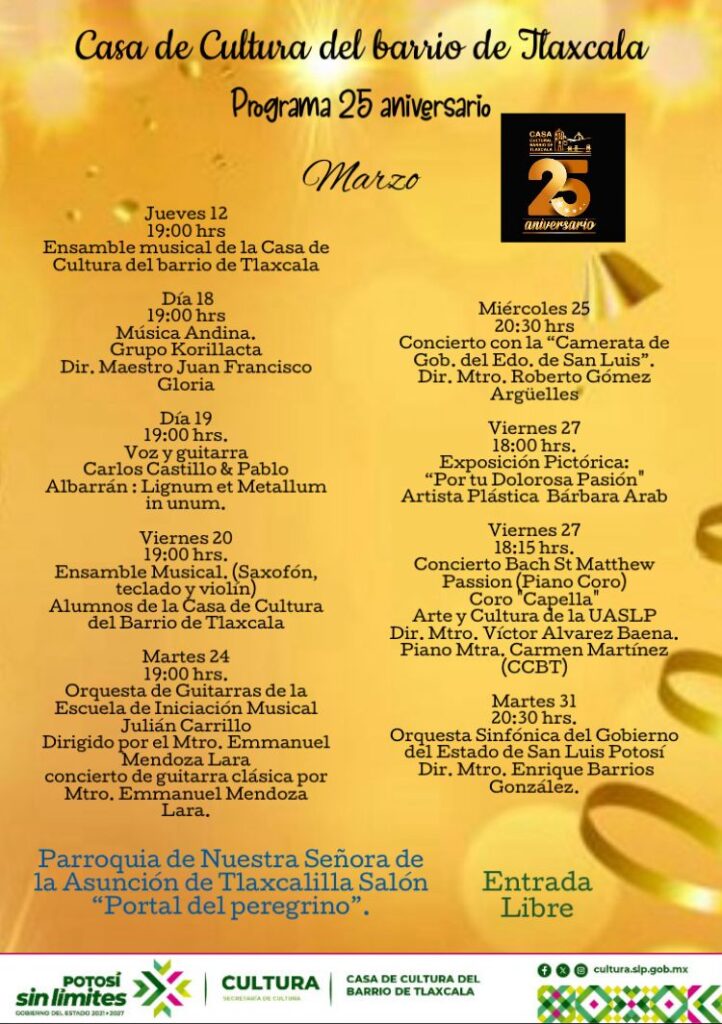Con motivo de esta fecha, conmemoramos con euforia los 25 aniversario de la casa de la cultura del barrio de Tlaxcala Presentando su ensamble musical, y diversas presentaciones de función para fomentar el arte de la música.