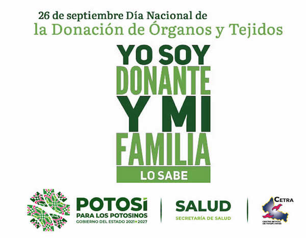 A partir de 2003 por decreto presidencial cada 26 de septiembre conmemoramos en México el Día Nacional de Donación y Trasplante de Órganos y Tejidos, con el fin de concientizar y reflexionar sobre el valor altruista de la donación. De acuerdo con el Centro Nacional de Trasplantes (CENATRA) en México hay más 19 mil personas inscritas a la espera de un trasplante, en San Luis Potosí son 249 los pacientes a la espera de un órgano o tejido que les devuelva la salud.
