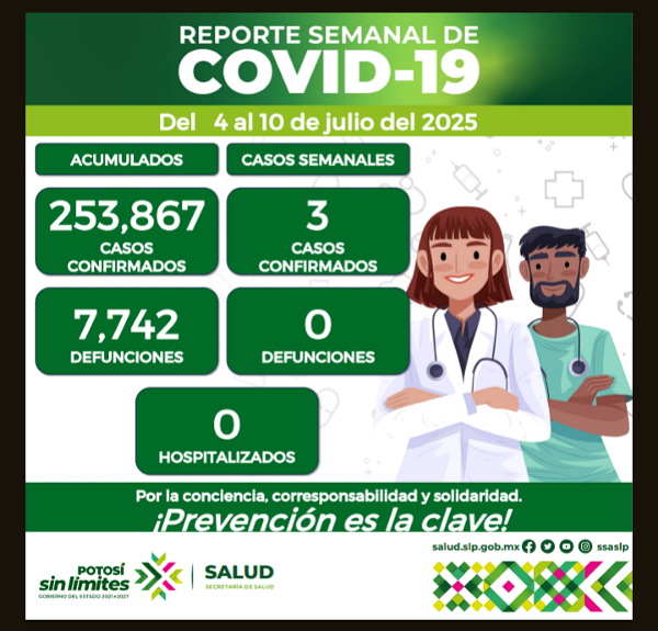 Los estudios de nuevos casos corresponden a 3 mujeres, todas con esquema incompleto de vacunación contra el virus, en un rango de edad de 20 a 36 años. Los nuevos casos se encuentran en los siguientes municipios: la Capital (1), y Ciudad Valles (2). En esta semana no se reportaron decesos por Covid, por lo que la cifra de muertes se mantiene en 7 mil 742 en el Estado.