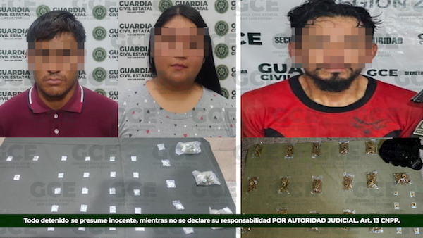 El primer hecho se registró en la colonia Díaz Ordaz en Santa María del Río, donde elementos de la GCE detuvieron a Martín “N” de 26 años y a Marlene “N” de 19 años, tras asegurarles la cantidad de 20 dosis de “cristal”, ocho dosis de cocaína y tres de marihuana. Mientras que en la carretera Cerritos-Mezquites Chicos en el municipio de Cerritos, David “N” de 34 años, fue asegurado con 16 dosis de marihuana y ocho dosis de “cristal”.