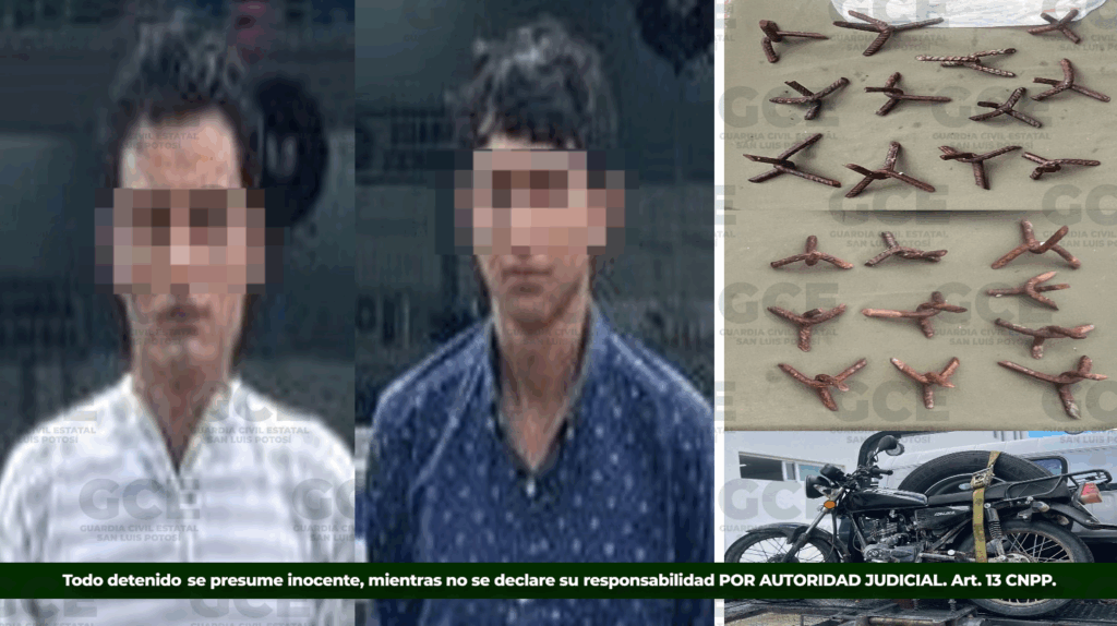 Los hechos ocurrieron, en la calle Contrato Colectivo y Mártires del Río Blanco, en el fraccionamiento Infonavit II, en el municipio de Ciudad Valles, San Luis Potosí, donde se detuvo a Miguel “N”, de 25 años, y Bryan “N”, de 23 años, quienes son vinculados a actividades conocidas como “halconeo” o informantes de una célula criminal, asegurándoles 22 objetos conocidos como “poncha llantas”, un teléfono celular y una motocicleta marca Italika, modelo FT125, color negro, modelo 2026.