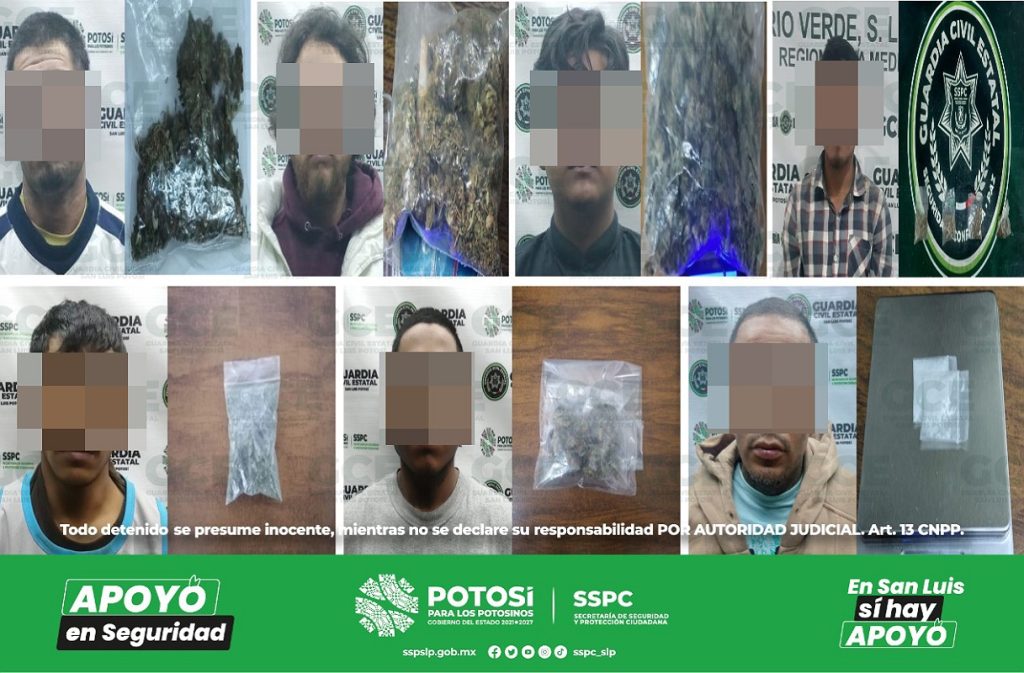 S.L.P.- Mediante el despliegue del Plan Integral de Seguridad en las cuatro regiones de San Luis Potosí, 14 presuntos resultaron detenidos por la Guardia Civil Estatal (GCE), luego de que se les aseguraran diferentes dosis de narcóticos en su poder.