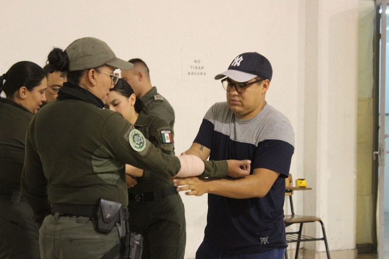 Cabe resaltar que el personal médico proporcionó a las y los elementos, técnicas de fácil acceso para poder actuar sin que la vida propia y de otras personas resulte afectada por un mal empleo de los instrumentos utilizados, en donde pudieron disipar sus dudas y, mediante una simulación, pudieron atender una emergencia en donde una persona presentaba dos posibles hemorragias.
