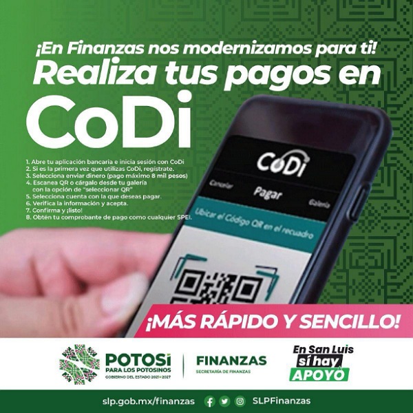 De acuerdo a la estrategia del Gobernador de San Luis Potosí, Ricardo Gallardo Cardona, para facilitar todos los trámites gubernamentales y reducir el tiempo de atención, la dependencia incorporó el Cobro Digital (CoDi) como medio de pago de impuestos, derechos y obligaciones, que se sumó a las distintas alternativas electrónicas como el Sistema de Pagos Electrónicos SIPEL, los Centros Electrónicos de Trámites y Servicios o Kioscos, y la aplicación para dispositivos móviles para pagos sin acudir a oficinas recaudadoras.