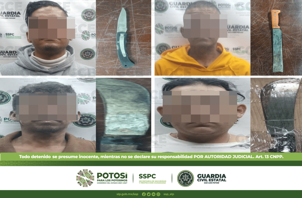 San Luis Potosí, S.L.P.- En distintas acciones operativas y de vigilancia, elementos de la Guardia Civil Estatal (GCE) detuvieron a cuatro hombres que deambulaban en distintos sectores de la ciudad con armas blancas y/o punzocortantes.