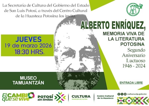 La Secretaría de Cultura de Gobierno del Estado invita al público en general al evento artístico-cultural “Alberto Enríquez, memoria viva de la literatura potosina”, que se llevará a cabo el jueves 19 de marzo a las 18:30 horas en el Museo Tamuantzán del Centro Cultural de la Huasteca Potosina, como homenaje al escritor huasteco en su segundo aniversario luctuoso.