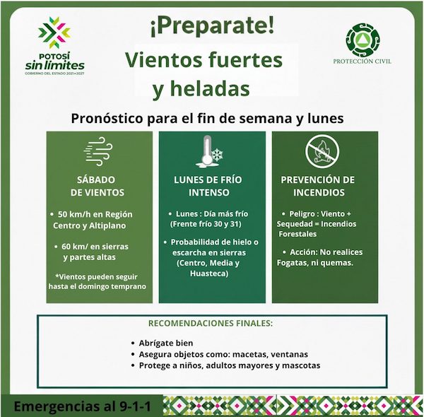La Coordinación Estatal de Protección Civil (CEPC) emitió un aviso preventivo ante la presencia de vientos fuertes y un descenso significativo de temperatura en San Luis Potosí durante los próximos días. El seguimiento permanente a las condiciones climatológicas responde a la instrucción del Gobernador Ricardo Gallardo Cardona de fortalecer la prevención y la protección de las familias.
