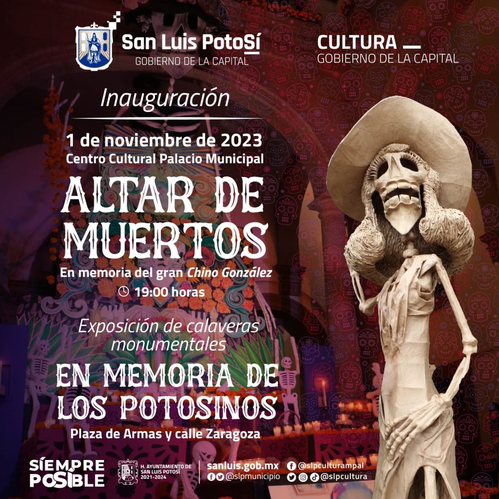 Altar de Muertos que es dedicado a la memoria del “Chino González” y la Exposición de Calaveras Monumentales dedicada a personajes de la historia y leyenda potosina. A partir del 1 de noviembre podrán ser disfrutada por potosinos y visitantes del Centro Histórico.