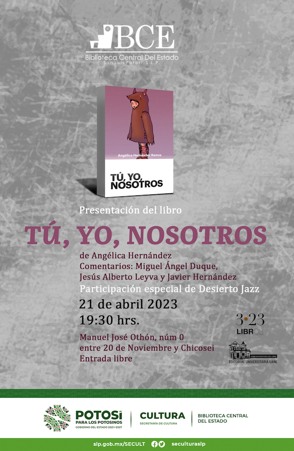 La Secretaría de Cultura de San Luis Potosí invita al público en general a la presentación del libro “Tú, yo, nosotros” de Angélica Hernández, en la Biblioteca Central del Estado, que se llevará a cabo este viernes 21 de abril a las 19:00 horas, entrada libre.