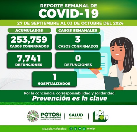 Del 27 de septiembre al 03 de octubre del presente año, se registraron tres nuevos contagios de COVID-19 confirmando el Comité Estatal para la Seguridad en Salud y los Servicios de Salud 253 mil 759 casos totales de esta enfermedad.