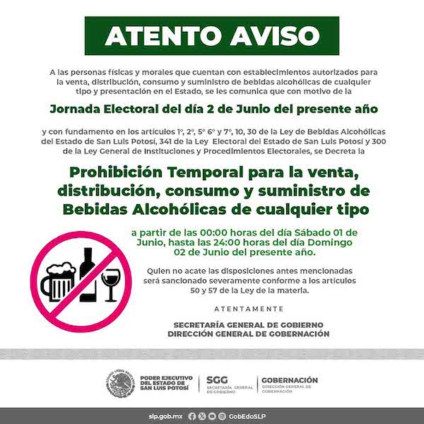 Para mantener la paz social que se vive en San Luis Potosí durante el actual proceso electoral y contribuir a que continúe la tranquilidad durante los comicios del próximo 2 de junio de 2024, el Poder Ejecutivo del Estado a través de la Dirección General de Gobernación anunció que se decretará suspensión de la venta de bebidas alcohólicas, comúnmente llamada “Ley Seca”, durante el día de la jornada electoral y un día previo.