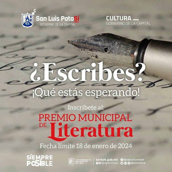 La Dirección de Cultura Municipal y la Comisión de Cultura, Recreación, Deporte y Juventud, hacen una última invitación para escritoras y escritores potosinos a participar en el Premio Municipal de Literatura 2023, en sus modalidades Raquel Banda Farfán para Cuento y Félix Dauajare Torres para Poesía.