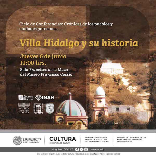 La dependencia refirió que el jueves 6 de junio, se realizará la conferencia “Villa Hidalgo y su Historia”, en el Museo Francisco Cossío, a las 19:00 horas que forma parte del ciclo “Crónicas de los pueblos y ciudades potosinas”, en colaboración con la Secretaría de Cultura (Secult), a través de la Coordinación de Protección del Patrimonio Cultural y el Consejo de la Crónica de los Municipios, el Colegio de San Luis y el Instituto Nacional de Antropología e Historia.