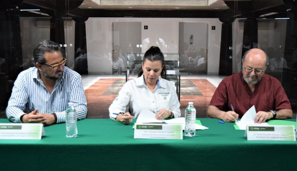 SAN LUIS POTOSÍ, SLP. – Para hacer sinergia a favor de la aplicación de modernos sistemas informáticos y nuevas tecnologías en el trabajo que realiza el Gobierno del cambio que lidera Ricardo Gallardo Cardona, el Archivo Histórico del Estado “Lic. Antonio Rocha”, firmó un convenio de colaboración con el Colegio de San Luis (Colsan), con el que se implementarán acciones conjuntas para la transformación de la práctica archivística en San Luis Potosí.