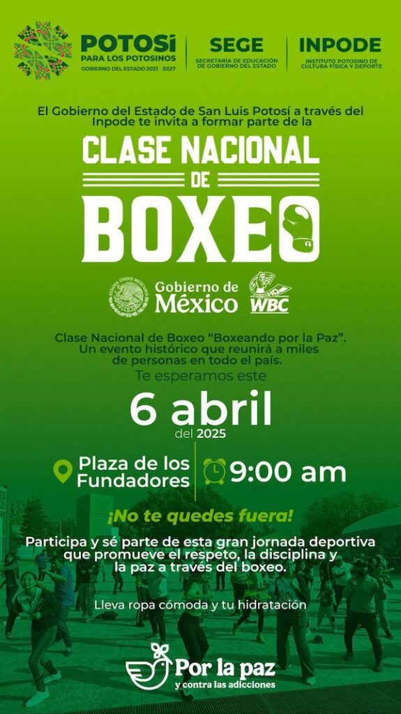 San Luis Potosí se unirá a la Clase Nacional de Boxeo, este domingo 6 de abril, a las 9:00 horas en la plaza de Los Fundadores, una jornada deportiva gratuita y abierta para todo público, que busca trabajar a favor del bienestar y en contra de las adicciones. En el marco del Día Internacional del […]