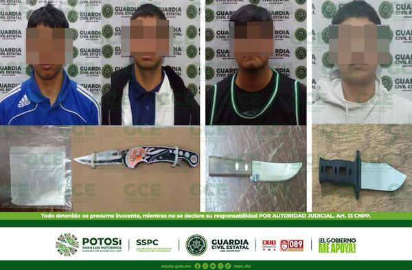 S.L.P.- Patrullajes de seguridad, desdoblados por la Guardia Civil Estatal (GCE) derivaron en la detención de cuatro personas, por el probable delito de portación de armas blancas, entre ellos a uno se le aseguró una dosis de “cristal”. En la capital potosina resultaron detenidas dos personas, la primera se ubicó en la colonia Estrella de […]