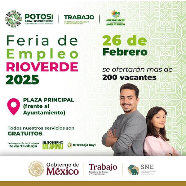 La Secretaría del Trabajo y Previsión Social (STPS), en colaboración con el ayuntamiento de Rioverde, realizará una Feria de Empleo este miércoles 26 de febrero, en la plaza principal del municipio, de 9:00 a 14:00 horas, para acercar más apoyo y mejores oportunidades a las familias rioverdenses con empleos bien pagados. La feria del empleo […]