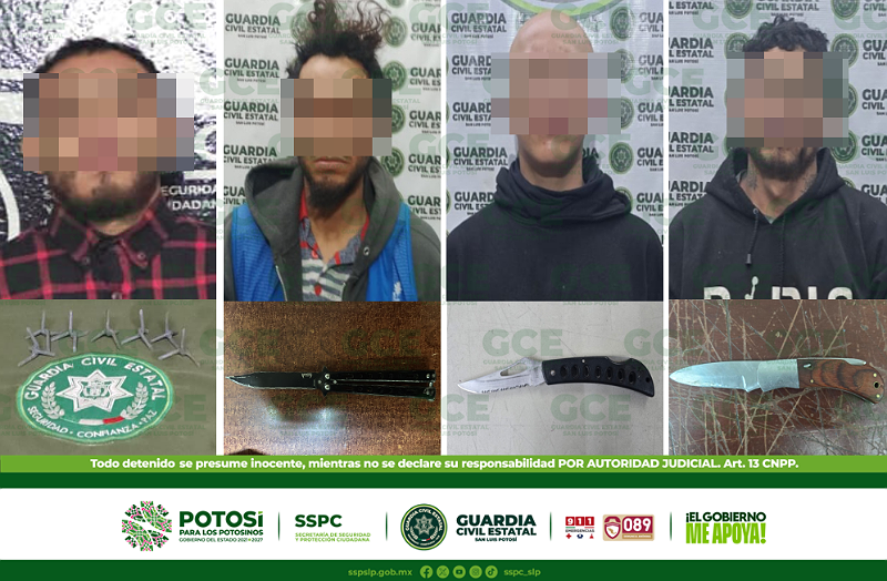 S.L.P.- Diferentes operativos de seguridad, desplegados por la Guardia Civil Estatal (GCE), para inhibir hechos delictivos, permitió la detención de cuatro personas, por los presuntos delitos de portación de armas punzocortantes y posesión de artefactos “poncha llantas”. En la colonia Terremoto, elementos de la GCE detuvieron a Jorge “N” de 28 años de edad, luego […]