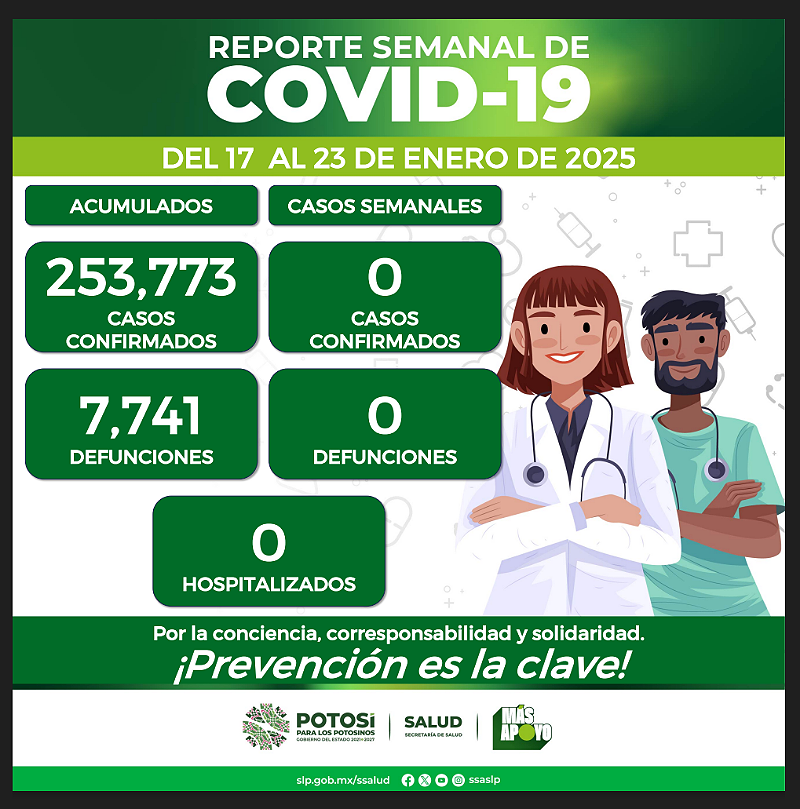 Del 17 al 23 de enero del 2025 en San Luis Potosí no se registraron nuevos casos por Covid-19. Se recomienda no bajar medidas de cuidado ante los cambios bruscos de temperatura. Los Servicios de Salud en el Estado y el Comité Estatal para la Seguridad en Salud piden a la población mantener las medidas […]