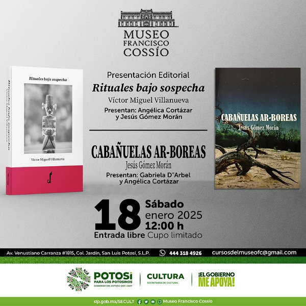 La cita es este sábado 18 de enero a las 12:00 h, en la biblioteca Ramón Alcorta del Museo Francisco Cossío. La Secretaría de Cultura de Gobierno del Estado invita al público en general a participar en la doble presentación editorial de las obras «Rituales bajo sospecha» de Víctor Miguel Villanueva y «Cabañuelas Ar-boreas” de […]