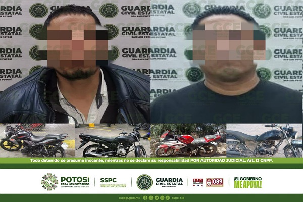 S.L.P.- Agentes de la Guardia Civil Estatal, recuperaron cuatro motocicletas con reporte de robo y detuvieron a dos personas, luego de los recorridos de seguridad y vigilancia efectuados en todo el territorio potosino. Elementos estatales, recuperaron una motocicleta Italika color gris modelo 2024, robada en la colonia Simón Díaz y recuperada en la colonia Nueva […]
