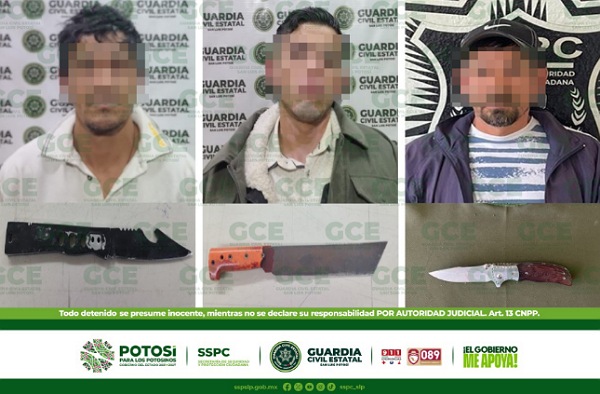 S.L.P.- Patrullajes preventivos, efectuados por la Guardia Civil Estatal (GCE), derivaron en la detención de tres hombres, por el probable delito de portación de armas blancas. En la capital potosina se ubicó a dos masculinos; uno de ellos en la colonia General I. Martínez, se trata de Francisco “N” de 46 años de edad, asegurado […]