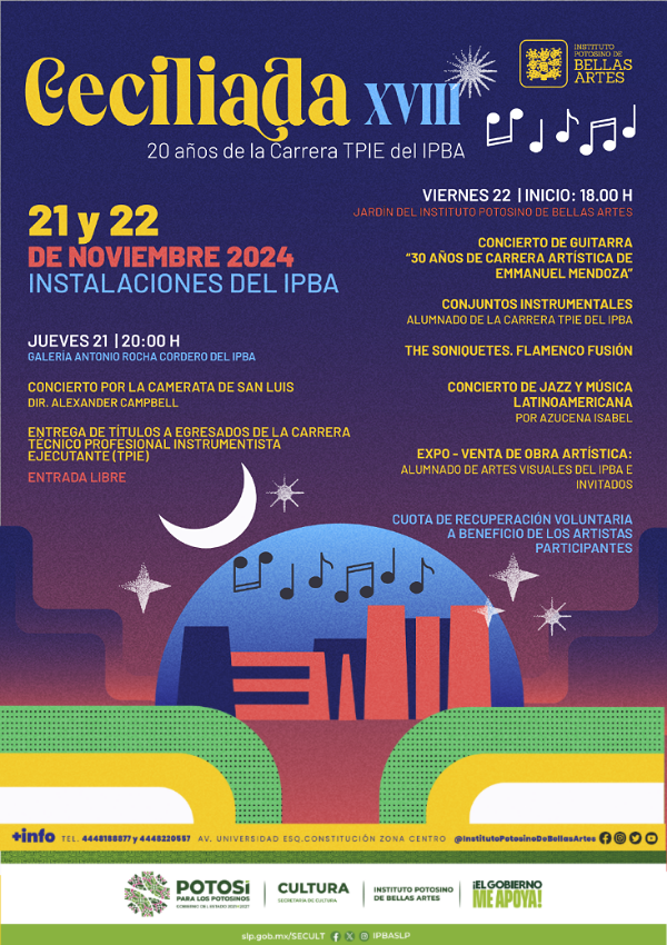 Se llevará a cabo los días jueves 21 y viernes 22 de noviembre con una interesante variedad de conciertos. La Secretaría de Cultura de Gobierno del Estado invita la comunidad a celebrar el 20º aniversario de la Carrera de Técnico Profesional Instrumentista Ejecutante (TPIE) del Instituto Potosino de Bellas Artes en la Ceciliada XVIII, los […]