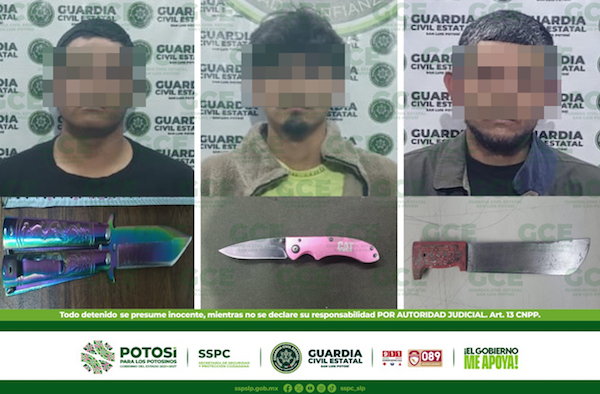 S.L.P.- En diferentes operativos de seguridad, efectivos de la Guardia Civil Estatal (GCE) detuvieron a tres presuntos, por la portación de armas punzocortantes, dos de ellos se ubicaron en la capital y uno más en el municipio de Soledad de Graciano Sánchez. Los agentes estatales recorrían la colonia Industrial Aviación, sitio donde ubicaron y detuvieron […]