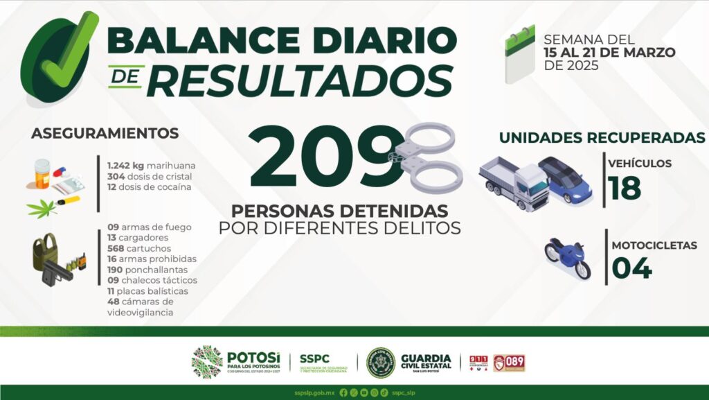 S.L.P.- Gracias a las acciones de seguridad efectuadas dentro del Plan Integral de Seguridad, la Secretaría de Seguridad y Protección Ciudadana del Estado, informa que policías de la Guardia Civil Estatal (GCE) detuvieron a 209 personas en el periodo comprendido del 15 al 21 de marzo de 2025, con estas acciones se refrenda el compromiso […]