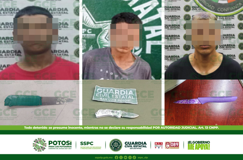 Por el probable delito de portación de armas blancas, tres hombres son detenidos por guardia civil estatal