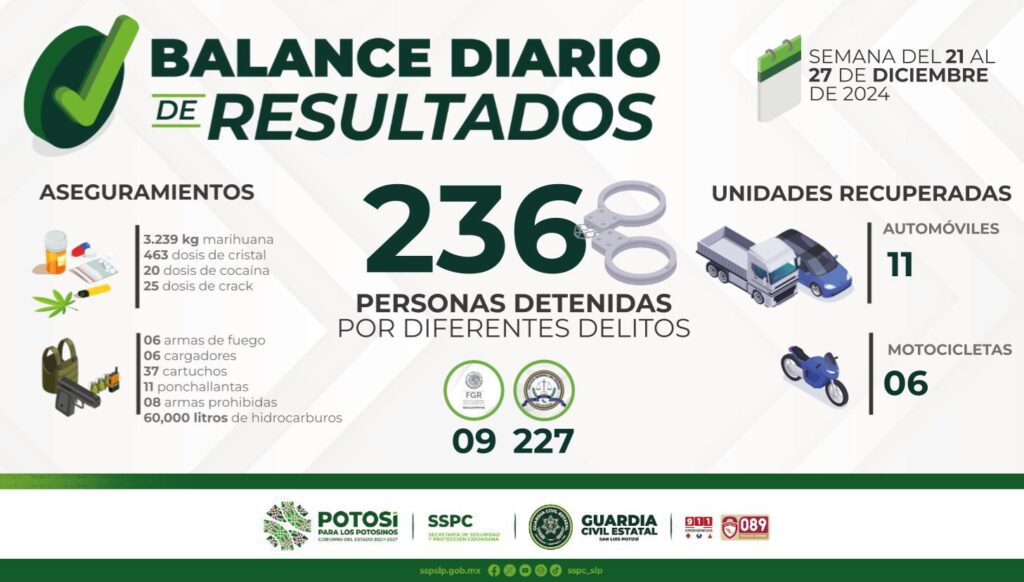 -Con resultados contundentes, el Plan Integral de Seguridad arrojó 23 objetivos criminales detenidos, vinculados a posibles actividades de narcomenudeo. -Además, se logró la captura de una posible banda dedicada al robo de transportes de carga, tras los operativos de la División Caminos de la GCE. S.L.P.- A lo largo de este 2024, la Secretaría de Seguridad y […]
