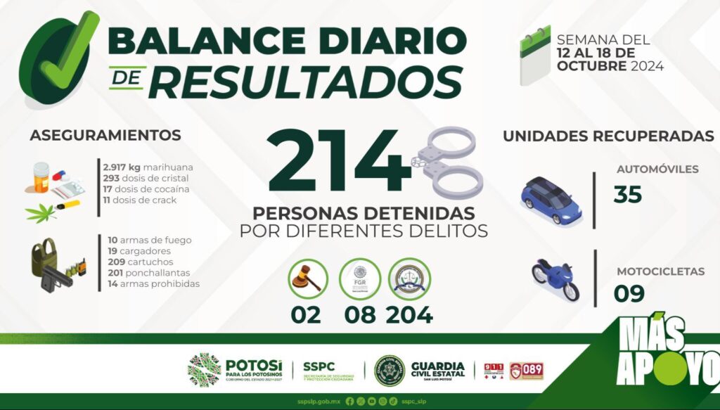 -Esta semana se destacó la captura de importantes objetivos criminales, a quienes se les aseguró arsenal de armas de fuego, equipo de tecnología. -Además, se rescató a una menor de 13 años, originaria del Estado de Nuevo León, quien presumiblemente fue sustraída por un adulto, de su ciudad natal. S.L.P.- Durante el periodo comprendido del 12 […]