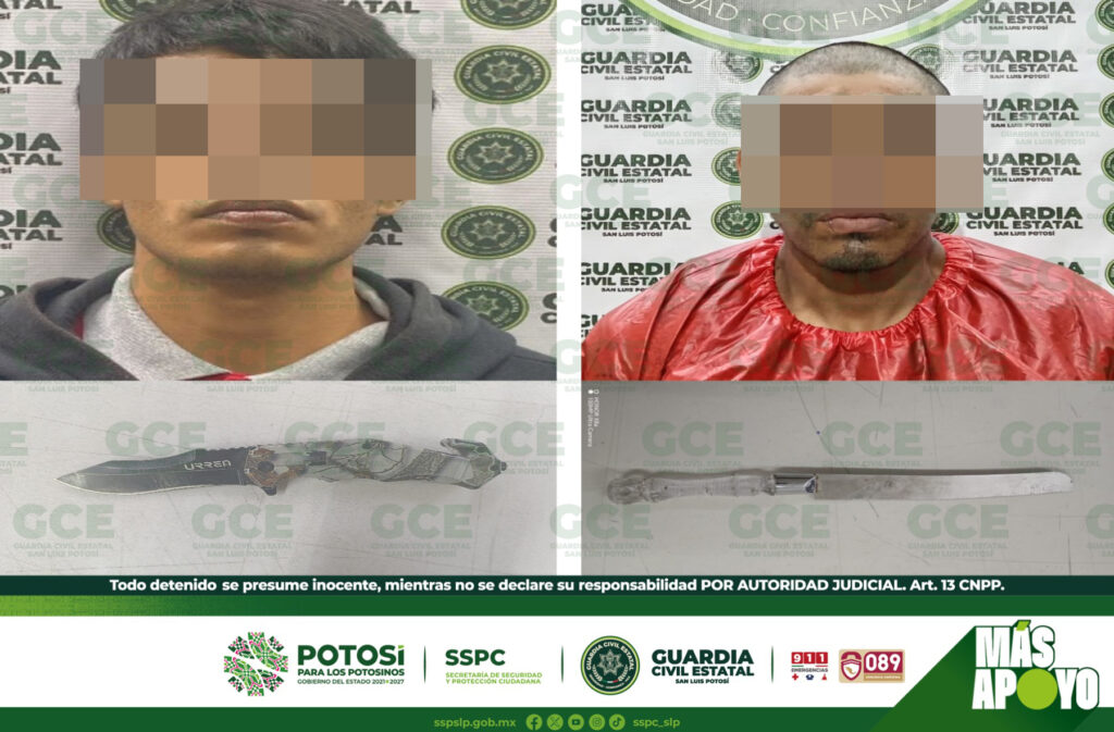 San Luis Potosí, S.L.P.- En diferentes operativos de seguridad, efectivos de la Guardia Civil Estatal (GCE) detuvieron a dos personas, por la presunta portación de armas blancas. En la colonia Nueva Progreso, efectivos de la GCE detuvieron a Ulises “N” de 21 años de edad, luego de asegurarle una navaja de 20 centímetros; mientras que […]