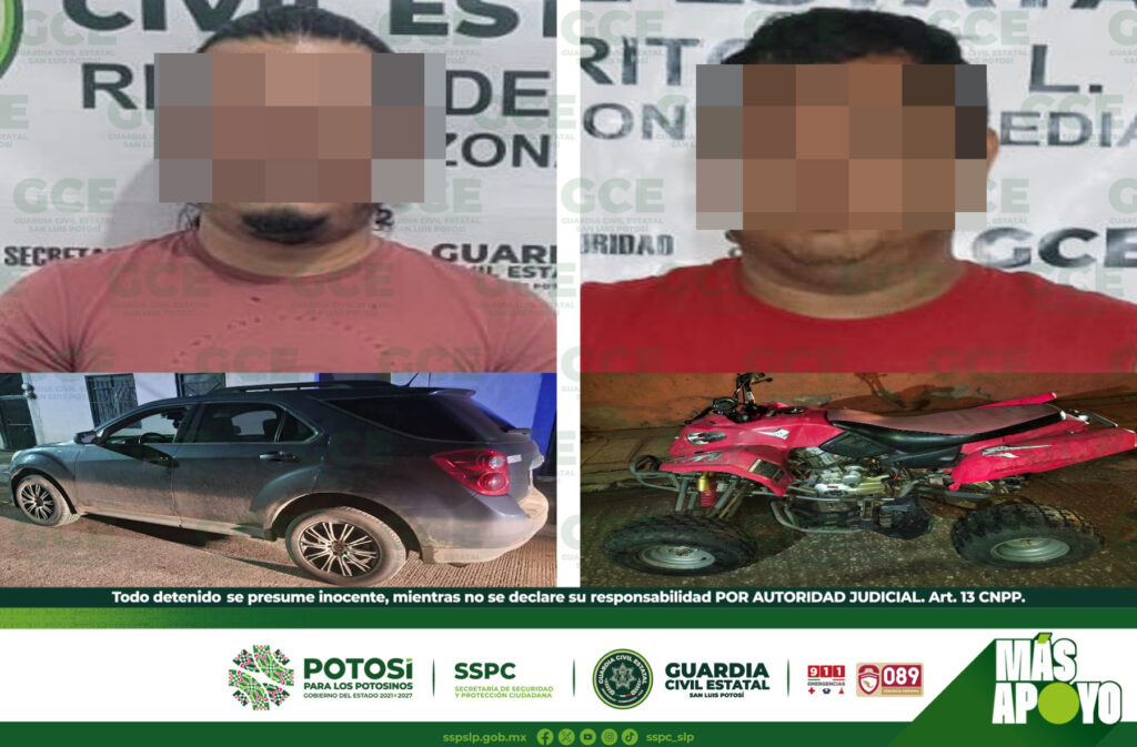 S.L.P.- Como resultado de los trabajos preventivos y disuasivos, efectuados por agentes de la Guardia Civil Estatal (GCE), dos hombres resultaron detenidos por presuntos delitos contra la seguridad de tránsito. Uno de los hechos ocurrió en el municipio de Rioverde, en la colonia San José, ahí fue detenido Edsson “N” de 35 años de edad, […]