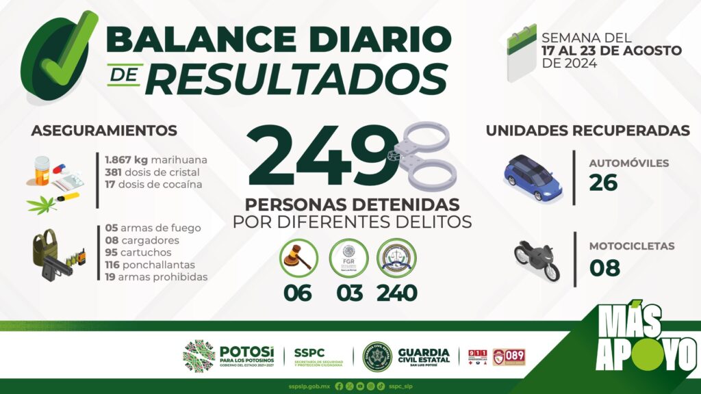-Destaca la detención de un objetivo criminal vinculado a 13 diferentes hechos delictivos. S.L.P.- Con acciones contundentes en materia de seguridad, la Guardia Civil Estatal (GCE) mantiene efectivos resultados y durante la penúltima semana del mes de agosto, resalta la detención de 249 personas, tres de ellas puestas a disposición de la Fiscalía General de […]