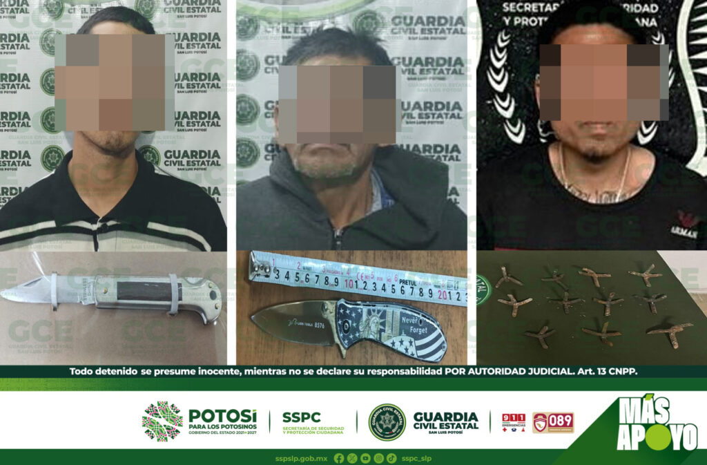-Uno de los asegurados portaba 11 artefactos de fabricación artesanal de varilla corrugada conocidos como «poncha llantas”. S.L.P.- Acciones contundentes en el combate a la delincuencia por parte de la Guardia Civil Estatal en todo el territorio potosino, permitió el aseguramiento en distintos hechos de tres personas que presuntamente llevaban consigo armas blancas y “poncha […]
