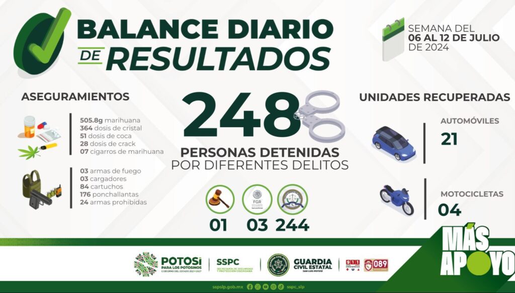 -Los resultados en el combate a la delincuencia, obedecen a las acciones operativas que desempeñó la Guardia Civil Estatal en el periodo del 06 al 12 de julio de 2024. S.L.P.- La Secretaría de Seguridad y Protección Ciudadana del Estado, informó la detención de 248 personas, como resultado del Plan Integral de Seguridad, desdoblado en […]