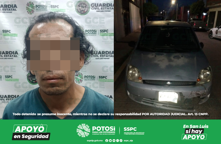 San Luis Potosí, S.L.P.- Un reporte emitido por el Centro de Control, Comando, Comunicaciones y Cómputo (C-4), derivó en la detención de un automovilista por oficiales de la Guardia Civil Estatal (GCE) después de que presuntamente lesionara a un motociclista tras impactar su unidad vehicular contra el afectado.