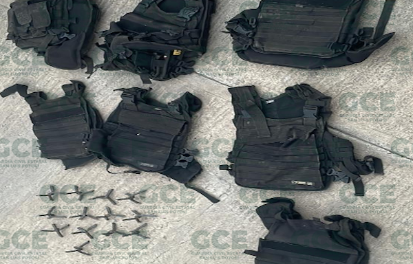 En el predio se aseguraron siete chalecos tácticos de color negro, así como 13 artefactos de varilla, conocidos como “poncha llantas”, lo anterior fue puesto a disposición de las autoridades correspondientes.