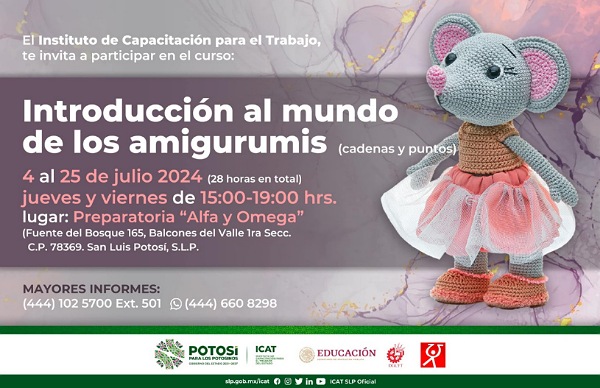 Para brindar más apoyo a las y los potosinos con nuevas oportunidades de negocio, del 4 al 25 de julio, el Instituto de Capacitación para el Trabajo (Icat), brindará el curso de “Introducción al mundo de los amigurumis” el arte japonés de elaboración de peluches tejidos, que ha logrado en México y San Luis Potosí un gran auge, lo que lo convierte en una buena opción para impulsar el emprendimiento y la generación de nuevas fuentes de empleo.