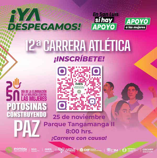 En el marco de las actividades para conmemorar el #25N, Día Internacional de la Eliminación de la Violencia contra la Mujer, el Instituto de las Mujeres del Estado (Imes), llevará a cabo este sábado 25 de noviembre, la carrera atlética con causa “Potosinas Construyendo Paz 2023”, en el parque Tangamanga II con salida y meta en la zona Kids a las 8:00 horas.