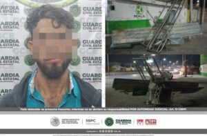 El hombre pretendía huir con una valla de seguridad del parador de Metrobús y diversa señalética. San Luis Potosí, S.L.P.- Oficiales de la Guardia Civil