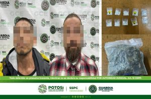 Soledad de Graciano Sánchez, S.L.P.- Oficiales de Guardia Civil Estatal (GCE) detuvieron a dos presuntos integrantes de un grupo criminal, quienes fueron sorprendidos con dosis