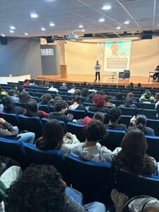 Ante un nutrido grupo de docentes y estudiantes reunidos en el Auditorio de la Facultad de Ciencias de la Comunicación, el periodista michoacano Edmundo Cázarez