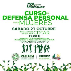 El Instituto Potosino de Cultura Física y Deporte (Inpode) y la Asociación Potosina de Artes Marciales Mixtas, realizarán el curso gratuito de defensa personal, dirigido