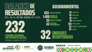 S.L.P.- Trabajos preventivos enfocados en preservar la paz en las cuatro regiones del Estado, permitieron la detención de 21 personas, por la probable comisión de