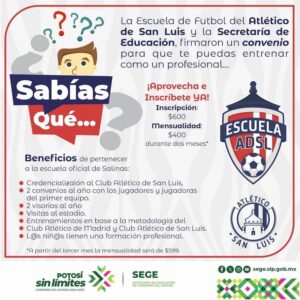 La Secretaría de Educación de Gobierno del Estado (SEGE) y la Escuela de Fútbol del Atlético de San Luis (ADSL) firmaron un convenio de colaboración