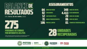-Acciones operativas sin límites en las cuatro regiones del Estado con resultados favorables en prevención y disuasión de hechos ilícitos. San Luis Potosí S.L.P.- Los