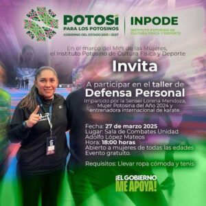 El Instituto Potosino de Cultura Física y Deporte (Inpode), invita a las mujeres a participar en el Taller gratuito de Defensa Personal, que será impartido